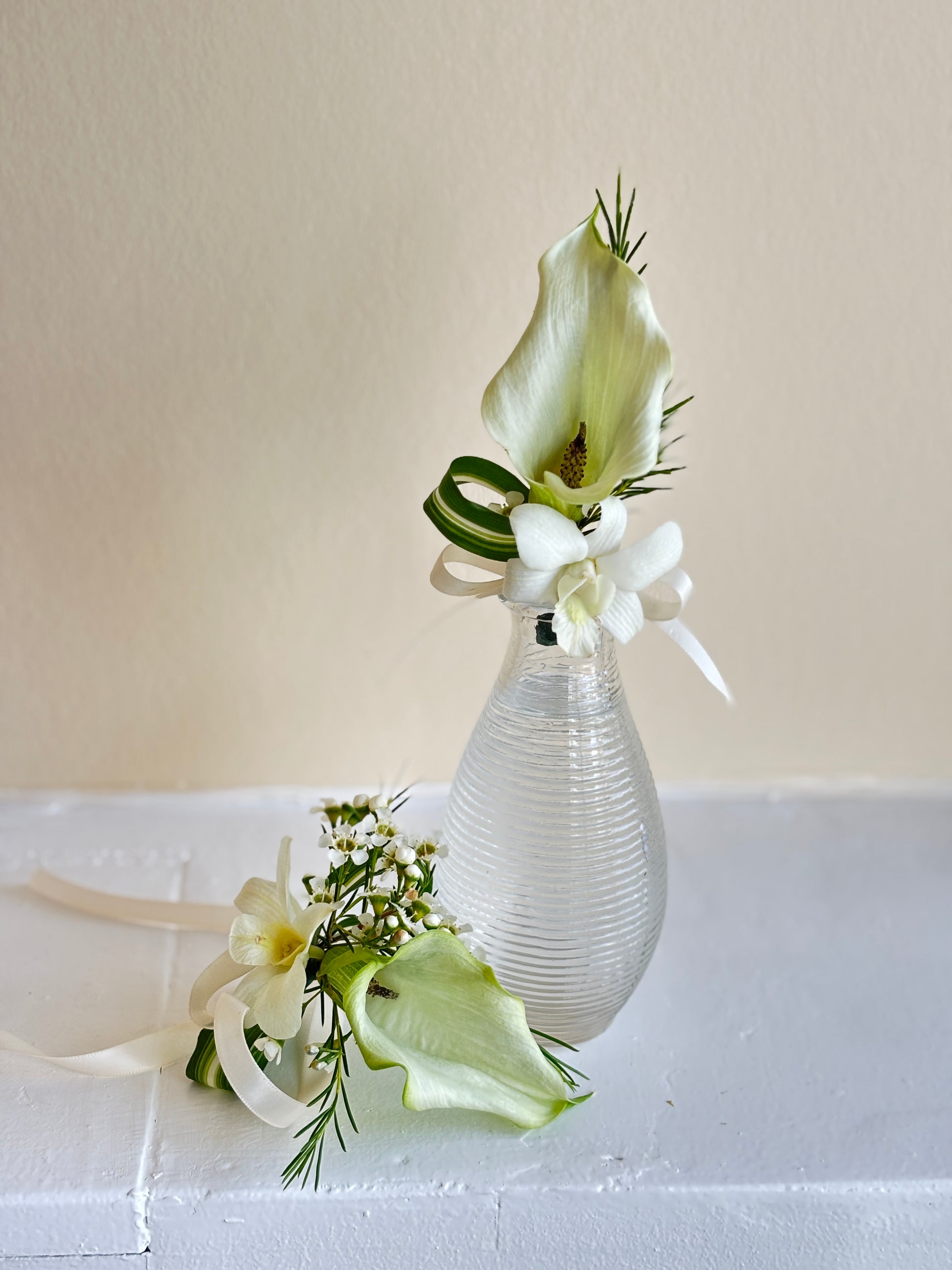 Flower Materials: White Calla and fresh flowers of the season